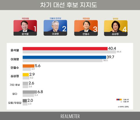 해당 조사에 따르면 윤 후보는 전주보다 4.0%P 떨어진 40.4%를 기록했다. 반면 이재명 더불어민주당 대선 후보는 1.7%P 오른 39.7%로 나타났다. 이에 두 사람 간 격차는 5.7%P나 줄어든 0.7%P로 오차범위 내 접전을 보였다.