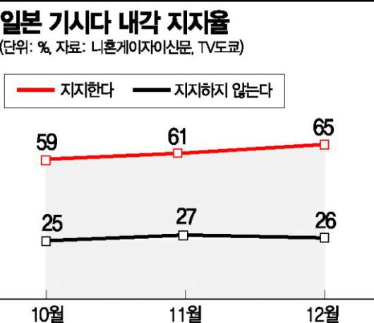 니혼게이자이신문과 TV도쿄가 24일~26일 공동으로 실시한 여론조사 결과에 따르면 기시다 내각의 지지율은 65%로 나타났다. 이는 전월(61%) 조사 대비 4% 포인트 상승한 수준이자, 지난 10월(59%) 기시다 내각 출범 이래 최고치다. 반면 기시다 내각을 지지하지 않는다는 응답은 26%로 전월(27%) 대비 1% 포인트 하락했다.