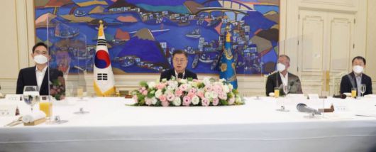 이날 간담회에는 이 부회장을 비롯해, 정의선 현대자동차그룹 회장, 최태원 SK주식회사 회장, 구광모 LG 회장, 최정우 포스코그룹 회장, 구현모 KT대표이사 등이 참석했다.