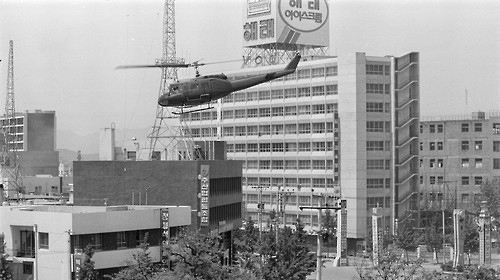 5.18 당시 전일빌딩 주변을 선회하는 헬기. 사진=연합뉴스 |