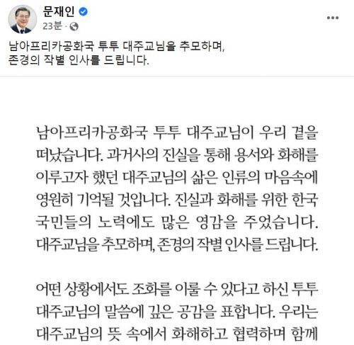 특히 문 대통령은 "진실과 화해를 위한 한국 국민들의 노력에도 많은 영감을 주었다. 대주교님을 추모하며, 존경의 작별 인사를 드린다"고 강조했다.