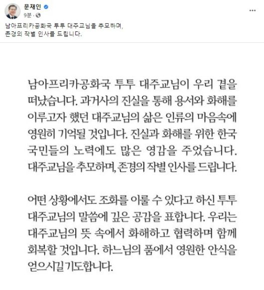 문 대통령은 27일 오후 SNS 메시지를 통해 "남아공 투투 대주교님이 우리 곁을 떠났다"라며 "과거사의 진실을 통해 용서와 화해를 이루고자 했던 대주교님의 삶은 인류의 마음속에 영원히 기억될 것"이라고 밝혔다.