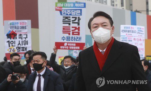윤 후보는 이날 오후 경기 성남시 '대장동 게이트' 현장을 찾아 민주당 이재명 후보와 민주당을 향해 특검 수용을 촉구했다.