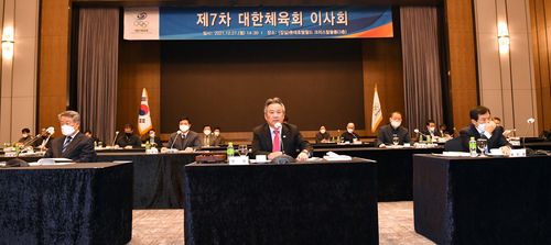 (서울=연합뉴스) 최송아 기자 = 대한체육회는 27일 오후 서울 송파구 롯데호텔월드에서 제7차 이사회를 열어 2022년 예산을 4천427억4천600만 원으로 의결했다.