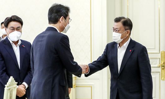 문재인 대통령이 27일 청와대에서 정부의 민관합동 청년 일자리 창출 사업인 ‘청년희망온(ON)’에 참여한 이재용 삼성전자 부회장과 인사하고 있다. 문 대통령과 이 부회장이 공식 석상에서 만난 것은 지난해 2월 문 대통령과 6개 그룹 대표 및 경제 5단체장과 간담회 이후 1년10개월여 만이다. 청와대사진기자단 ⓒ 세상을 보는 눈, 세계일보