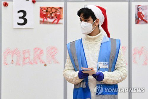 산타 모자를 쓴 영국 코로나19 백신 접종 센터 직원 |