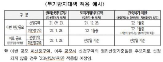 이번 공모에 미선정된 구역과 향후 공모를 신청하는 구역도 원주민 보호와 투기 차단을 위해 토지거래허가구역으로 지정하고 건축허가를 제한할 방침이다. 이번에 후보지에 선정되지 않은 구역의 권리산정기준일은 내년 1월28일부로 고시된다. 재개발 기대심리로 노후 저층주거지의 지분쪼개기 등 투기세력이 유입되는 것을 차단해달라는 주민 요청을 반영한 조치라고 시는 설명했다.