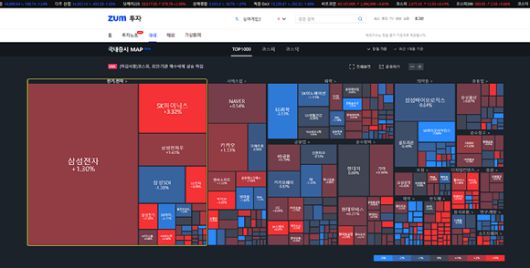 특히, ‘ZUM 투자’ 핵심 콘텐츠인 국내 및 해외증시 MAP을 통해 투자자는 업종·종목별 시가총액 비중과 주가 등락을 한 눈에 직관적으로 파악할 수 있다.