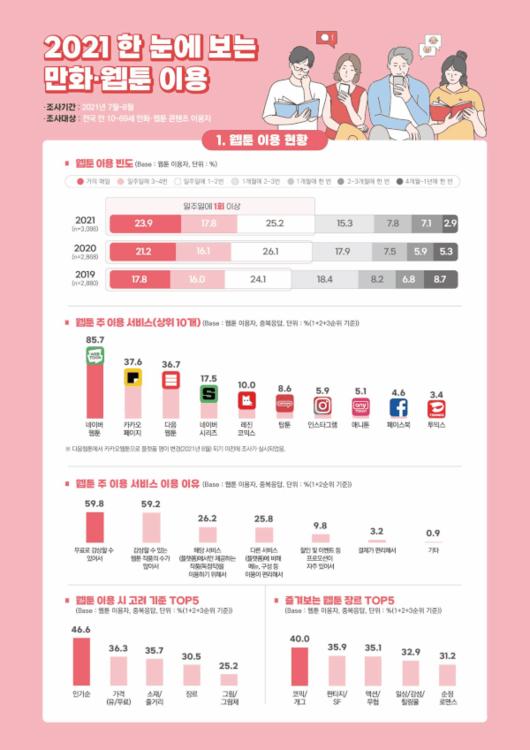 한국콘텐츠진흥원(원장 조현래)은 이같은 결과를 담은 '2021 만화웹툰·애니메이션·캐릭터·음악 이용자 실태조사' 보고서를 발간했다.