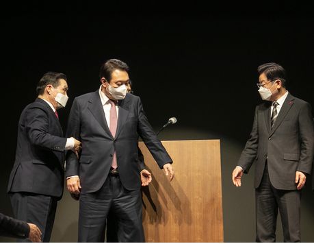 더불어민주당 이재명 대선후보와 국민의힘 윤석열 대선후보(왼쪽 두번째)가 28일 서울 여의도 페어몬트 앰배서더 서울 호텔에서 열린 국가균형발전을 위한 지방소멸대응특별법안 국회발의 간담회에 참석해 기념촬영을 하기 위해 단상에 오르고 있다. 〈사진=연합뉴스〉 |