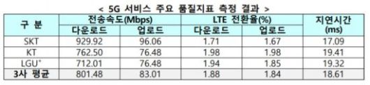 이통 3사의 5G 다운로드 전송속도는 평균 801.48Mbps로 전년(690.47Mbps) 대비 16.1% 향상됐다. 이는 LTE의 5.3배 수준이다. 업로드 속도는 평균 83.01Mbps로 전년(63.32Mbps)보다 31.1% 향상됐다. 통신사별로는 SK텔레콤 929.92Mbps(134.35Mbps↑), KT 762.50Mbps(95.02Mbps↑), LG유플러스 712.01Mbps(103.52Mbps↑) 순으로 빨랐다.