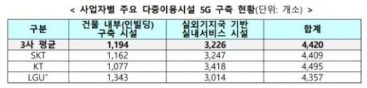 주요 다중이용시설 4500여개 중 5G 이용이 가능한 시설 수는 평균 4420개(98%)로 전년(2792개) 대비 58.3% 증가(10월 기준)했다. 통신사 별로는 KT 4495개, SK텔레콤 4409개, LGU+ 4357개로 많았다. 주요 다중이용시설 내 5G 접속가능 비율(5G 서비스에 안정적으로 접속된 면적)은 평균 95.36%로, 전년(90.99%) 대비 4.37%포인트 향상됐다.