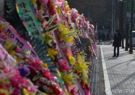 [서울=뉴스핌] 윤창빈 기자 = 박근혜 전 대통령의 특별사면을 앞둔 30일 오후 서울 강남구 삼성서울병원 앞에 지지자들이 가져다 놓은 화환이 줄지어 있다. 2021.12.30 pangbin@newspim.com 저작권자(c) 글로벌리더의 지름길 종합뉴스통신사 뉴스핌(Newspim), 무단 전재-재배포 금지