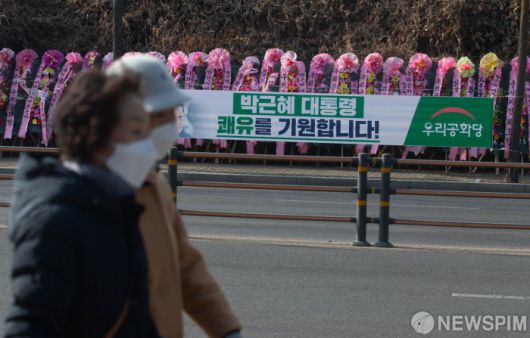 [서울=뉴스핌] 윤창빈 기자 = 박근혜 전 대통령의 특별사면을 앞둔 30일 오후 서울 강남구 삼성서울병원 앞에 지지자들이 가져다 놓은 화환이 줄지어 있다. 2021.12.30 pangbin@newspim.com