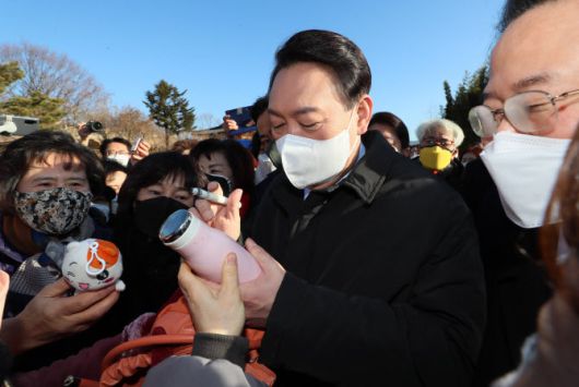 윤석열 국민의힘 대선 후보가 30일 오전 대구 동구 국립신암선열공원 임용상 의병장 묘역을 참배한 뒤 지지자들에게 사인해주고 있다. (사진=연합뉴스) |