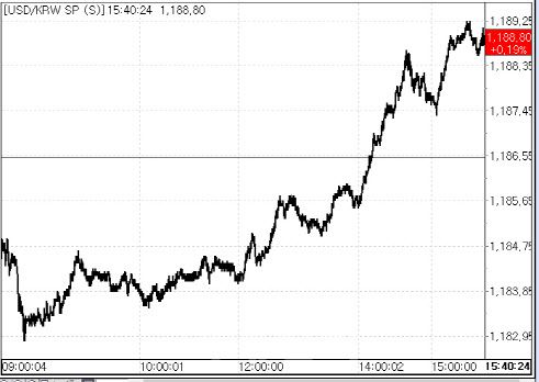 이날 환율이 상승 반전한 것은 국내증시에서 외국인 투자자가 매도 규모를 키우면서 코스피 지수가 낙폭을 확대하고, 미 달러화가 강세로 돌아선 영향이 컸다. 국내증시에서 외국인 투자자는 전일에 이어 이틀 연속 순매도 흐름을 보였다. 코스피 시장에서는 2300억원 가량 팔면서 코스피 지수도 0.52%내린 2977.65에 장을 마쳤다. 코스닥 시장에서도 외국인은 270억원 가량 매도했으나 개인이 2200억원 가량 사들이며 매수 우위를 보여 지수는 0.58% 가량 오른 1033.98을 기록했다.