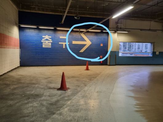 택시 차량이 홈플러스 주차장 벽을 뚫고 나간 현장 바로 아래층인 4층 모습. 동그라미 친 부분이 택시가 뚫고 나간 지점이다. 사진 황선윤 기자 |