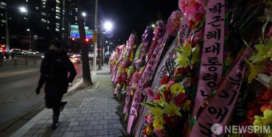 [서울=뉴스핌] 최상수 기자 = 박근혜 전 대통령의 신년 특별사면 전날인 30일 저녁 서울 강남구 삼성서울병원 앞에 박근혜 전 대통령의 지지자들이 보낸 화환이 늘어서 있다. 2021.12.30 kilroy023@newspim.com