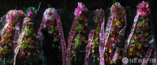 [서울=뉴스핌] 최상수 기자 = 박근혜 전 대통령의 신년 특별사면 전날인 30일 저녁 서울 강남구 삼성서울병원 앞에 박근혜 전 대통령의 지지자들이 보낸 화환이 늘어서 있다. 2021.12.30 kilroy023@newspim.com
