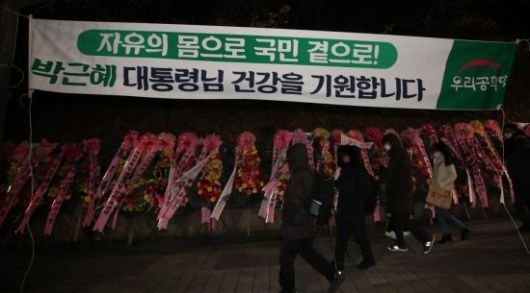 병원 앞 인도에는 박 전 대통령의 사면을 축하하는 화환이 늘어섰고 '박근혜 대통령님 건강을 기원합니다'라고 적힌 플래카드도 설치됐다. 보수 성향 유튜버들도 사면 환영 집회를 중계하기 위해 병원 인근에 모였다.