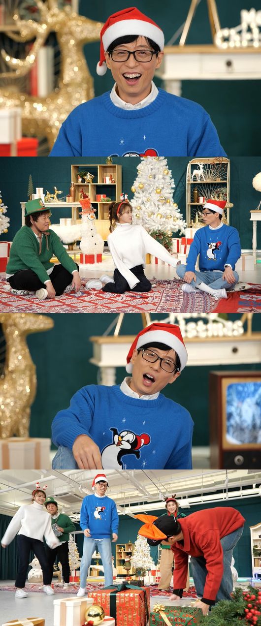 크리스마스를 맞이해 ‘놀면 뭐하니?+’ 멤버들은 ‘내 돈 내 산’ 크리스마스 선물을 나누는 시간도 가졌다. 즐거운 크리스마스 음악에 춤을 추며 한 사람 씩 선물 상자를 골라가는 방식으로 진행됐다.
