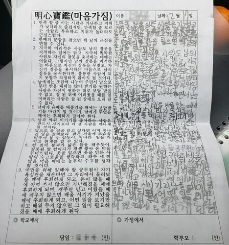 학급 인원 32명 중 가장 낮은 점수를 받았던 B 군은 3교시를 마친 뒤, 점심시간에 급식을 먹고 교실에 남아 '명심보감' 한글 문구를 베껴 써야 했습니다. 다른 친구들이 한참 놀 시간에 보충수업을 받는 일명 '머쓱이 처벌'을 받은 것입니다.