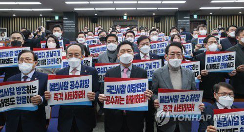 국민의힘 의원들은 의원총회에서 피켓을 들고 "국민사찰 야당탄압 공수처는 해체하라", "불법사찰 방종하는 이재명도 한몸이다", "감시국가 감시사회 문정권의 민낯이다" 등 구호를 외쳤다.