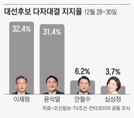 오는 3월 9일 치러지는 20대 대선을 두 달 여 앞두고 조선일보·TV조선이 실시한 대선 후보 4자 대결 여론조사에서 이재명 더불어민주당 후보(32.4%)와 윤석열 국민의힘 후보(31.4%)가 지지율 1%포인트 차이의 초접전을 벌이는 것으로 나타났다. 안철수 국민의당 후보는 6.2%, 심상정 정의당 후보는 3.7%였고 지지 후보가 ‘없다·모르겠다’는 21.9%였다. 칸타코리아에 의뢰해 한 달 전 실시한 조사(11월 29~30일)와 이번 신년 조사(12월 28~30일)를 비교하면 이 후보는 29.3%에서 3.1%포인트 상승한 반면 윤 후보는 35.6%에서 4.2%포인트 하락했다.
