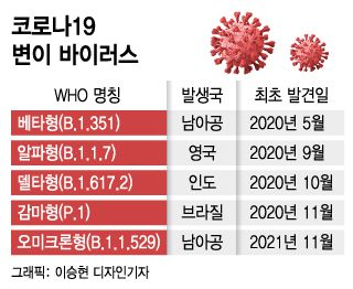 백신 기대감에 묻혀 당시 주목받지 못했지만, 2020년 12월 영국과 남아프리카공화국에서는 스파이크 단백질이 인간 세포 수용체와 결합하는 능력이 커져 전파 속도가 향상된 변이가 발견됐다. WHO는 이들을 '알파'와 '베타'로 각각 명명하며 '우려 변이'로 지정했다. 앞서 2020년 11월 브라질에서 발견된 변이는 뒤늦게 3번째 우려 변이인 '감마'로 지정됐다.