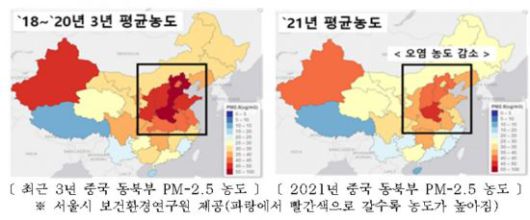 아울러 하반기 기상여건이 동풍 기류의 유입이 많았고 중국 동북부 지역의 대기질이 좋아진 점 또한 초미세먼지 농도가 낮아진 원인 중 하나로 추정했다. 2021년 동풍기류의 바람은 34.4%로 과거 10년 평균 25.7%보다 증가했다. 특히 북동풍은 2배 증가했다. 서울의 대기질에 영향을 미치는 중국 동북부의 ’21년 초미세먼지 연평균 농도 역시 최근 3년에 비해 감소했다.