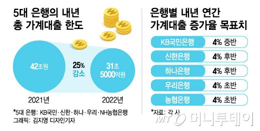 2일 금융당국과 은행권에 따르면 KB국민·신한·하나·우리·NH농협은행 등 5대 시중은행이 올해 늘릴 수 있는 가계대출 총량한도는 31조5000억원으로 파악된다. 지난해 가계부채 관리 성적표에 따라 은행들은 4% 초반~후반대의 목표치를 부여받았다. 은행별 한도는 국민은행이 7조5000억원, 신한·하나은행이 각각 6조5000억원·6조원, 우리·농협은행은 6조원·5조5000억원 수준으로 추산된다. 5대 은행의 올해 총량 한도는 지난해 가계대출 공급액(약 42조원)보다 25% 가량 줄어든 규모다.
