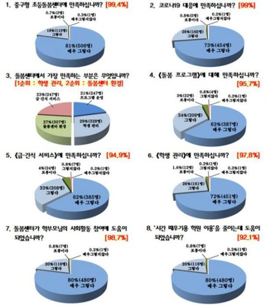 지역 내 초등돌봄센터 이용 학부모를 대상으로 지난달 구에서 실시한 만족도 조사 결과에 따르면 응답자의 99.4%가 만족한다고 답했으며 전체 16개 센터 중 13개소에서 100% 만족도를 보였다. 구는 현재 지역내 모든 공립초등학교 돌봄교실 9개소와 학교 밖 돌봄센터 7개소를 직영으로 운영하고 있다.
