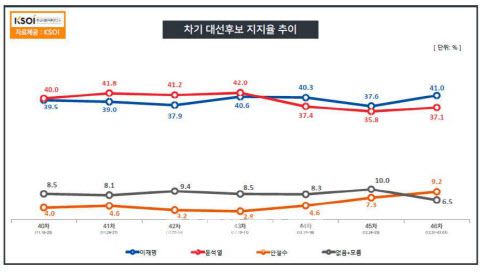 여론조사기관 한국사회여론연구소(KSOI)가 3일 TBS 의뢰로 지난 31일부터 1일까지 전국 만 18세 이상 남녀 1002명을 대상으로 조사한 결과 이 후보 41.0%, 윤 후보 37.1%를 기록했다. 전주 대비 이 후보는 3.4%포인트 올랐다. 윤 후보는 1.3%포인트 상승했다. 이에 따라 격차 폭이 1.8%포인트에서 3.9%포인트로 확대됐다.