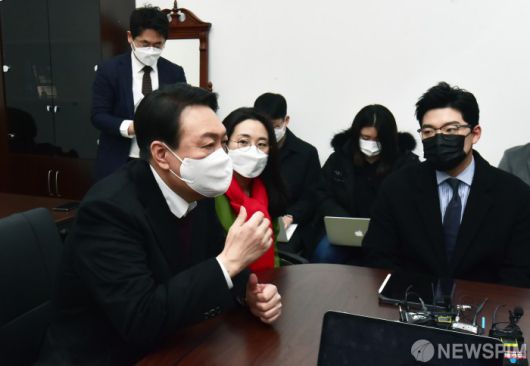 [서울=뉴스핌] 최상수 기자 = 윤석열 국민의힘 대선후보가 지난달 20일 서울 여의도 새시대준비위원회 위원장실에서 열린 영입인사 환영식 참석, 녹색당 공동운영위원장을 지낸 신지예 한국여성정치네트워크대표를 환영 후 모두발언하고 있다. 신 대표는 윤석열 국민의힘 대선 후보 선거대책위원회 산하 새시대 준비위원회에서 수석 부위원장으로 활동한다. 2021.12.20 kilroy023@newspim.com |