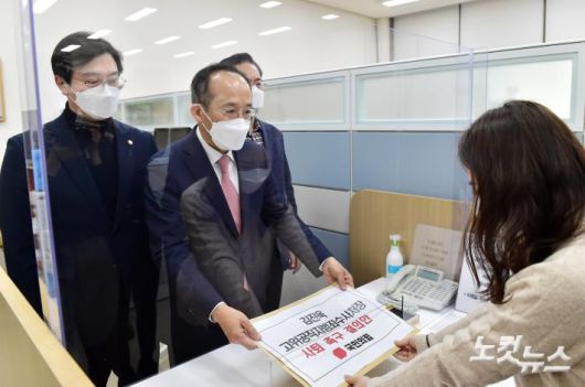 추경호 국민의힘 원내수석부대표와 강민국 원내대변인, 유상범 의원이 3일 국회 의안과에 김진욱 고위공직자범죄수사처장 사퇴 촉구 결의안을 제출 하고 있다.저작권자 © CBS 노컷뉴스 무단전재 및 재배포 금지
