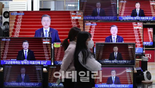 문재인 대통령 신년사 발표가 열린 3일 오전 서울 용산구 용산전자상가에 진열된 TV에서 중계방송이 나오고 있다. (사진=이영훈 기자) |