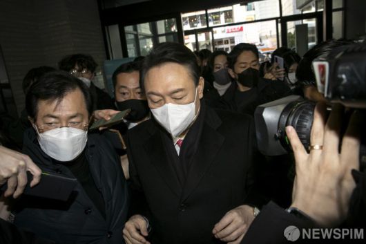 [서울=뉴스핌] 이형석 기자 = 윤석열 국민의힘 대선후보가 3일 오전 모든 일정을 취소하고 서울 영등포구 국민의힘 당사로 들어오고 있다. 2022.01.03 leehs@newspim.com |