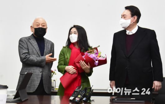 윤석열 국민의힘 대선 후보가 지난 12월20일 서울 여의도 새시대준비위원회 위원장실에서 열린 영입인사 환영식에서 김한길 위원장, 신지예(가운데) 한국여성정치 네트워크 대표와 기념촬영을 하고 있다. [사진=김성진 기자] |