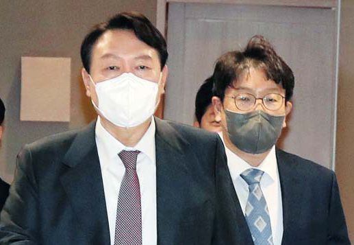 윤석열 국민의힘 대선후보가 2021년 11월18일 중진 의원들과 오찬을 하기 위해 권성동 사무총장과 함께 서울 여의도 한 식당에 들어가고 있다. /연합뉴스 |