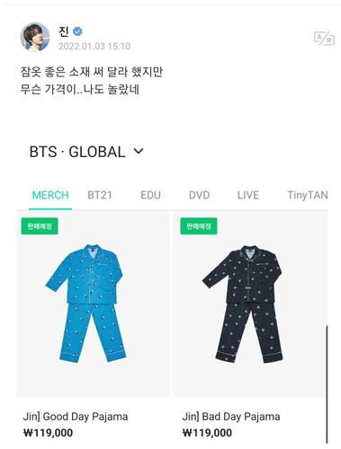 방탄소년단 진이 제작에 참여한 잠옷 가격과 이에 대한 진의 위버스 코멘트 |