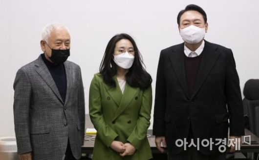 윤석열 국민의힘 대선후보가 20일 서울 여의도 중앙당사 새시대 준비위원회 위원장실에서 열린 영입인사 환영식에 참석, 김한길 위원장과 영입 인사인 신지예 한국여성정치네트워크 대표와 기념촬영을 하고 있다./윤동주 기자 doso7@ |