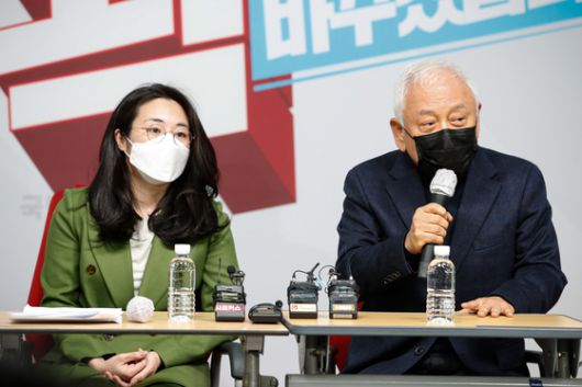 (서울=뉴스1) 이승배 기자 = 김한길 국민의힘 새시대준비위원회 위원장이 20일 오후 서울 여의도 국민의힘 당사에서 기자간담회를 갖고 있다. 왼쪽은 이날 합류한 신지예 수석 부위원장. 2021.12.20/뉴스1 |