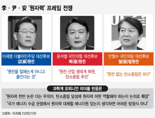 이재명 더불어민주당 후보는 현정부의 탈원전 정책에서 한발 물러섰다. 지난달 22일 과학기술 분야 정책공약을 발표하면서 "이재명 정부의 미래 원자력 발전 정책은 감(減)원전 정책"이라고 밝혔다.