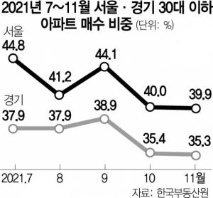 4일 한국부동산원의 지난 2021년 11월 서울 아파트 연령대별 매수 비중에 따르면 30대 이하의 비중은 39.9%를 기록해 10월(40.0%)에 비해 소폭 감소했다. 9월(44.1%)과 비교해서는 4.2%포인트나 줄어든 것으로 나타났다. 경기에서도 30대 이하의 매수 비중이 줄었다. 지난해 9월 경기 아파트 매수인 가운데 30대 이하의 비중은 38.9%였지만 10월 35.4%를 기록한 데 이어 11월 35.3%로 두 달 연속 감소했다.