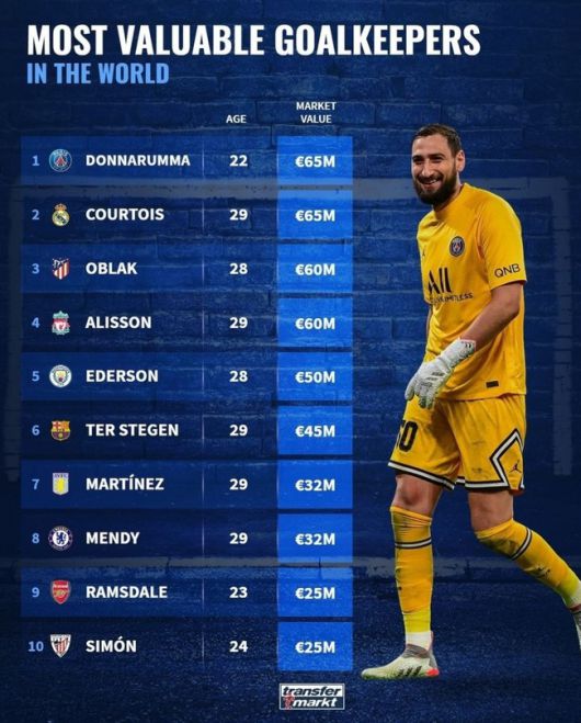 축구 통계 매체 '트랜스퍼마크트'는 전 세계 골키퍼 중에 가장 높은 몸값을 기록한 선수 10인을 공개했다. 해당 매체는 계약 기간, 현재 활약, 나이 등 여러 가지 기준을 고려해 선수가 가지는 가치를 금액으로 표시한다.