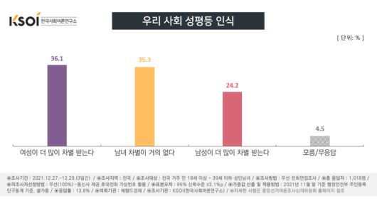 헤럴드경제가 한국사회여론연구소(KSOI)에 의뢰해 지난해 12월 27~29일 만 18~39세 청년 1018명에게 우리 사회 성평등 인식을 조사한 결과, ‘여성이 더 많이 차별 받는다’는 의견이 36.1%로 가장 많은 응답률을 보였다.