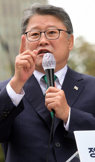 조원진 우리공화당 대표가 지난해 10월 서울 청계광장에서 대통령 출마 선언을 하고 있다. 공동취재사진 |