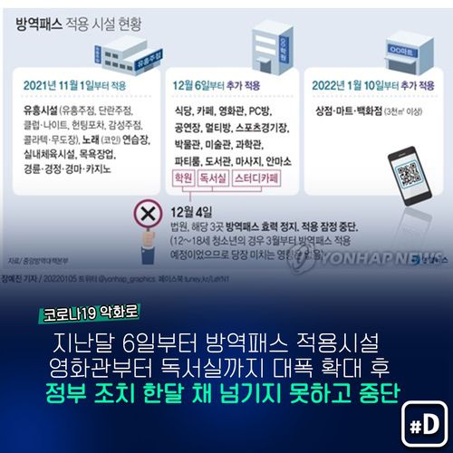 애초 실내체육시설, 유흥시설 등 일부 고위험시설에만 방역패스를 도입했으나 이후 코로나19 상황이 악화하자 같은 해 12월 6일부터 방역패스 적용시설을 식당, 카페, 학원, 영화관, 독서실, 스터디카페, PC방 등으로 대폭 확대했습니다.
