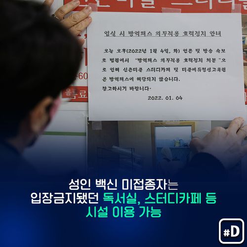 시험 등을 준비 중인 미접종 성인은 접종 증명서나 PCR(유전자증폭) 음성확인서 없이도 학원에 등록할 수 있고, 독서실과 스터디카페도 자유롭게 이용할 수 있습니다. 이는 행정소송 본안 판결이 나올 때까지 유지됩니다.