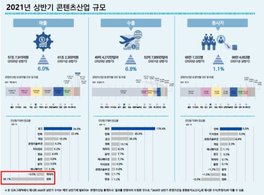 지난 달 21일 문화체육관광부와 한국콘텐트진흥원이 발간한 '2021년 상반기 콘텐트산업 동향분석보고서'에 따르면 광고, 만화, 게임, 방송, 출판 등 여러 분야가 동기 대비 가파르게 성장했지만 유일하게 영화만 -36.1%로 큰 폭의 마이너스 성장을 기록했다. 콘텐트산업 내 비중으로 봐도 전체의 1.6%를 차지하며 미미한 존재감을 보였다. 방송, 게임, 음악은 각각 15.7%, 15.1%, 9.7%를 차지했다.